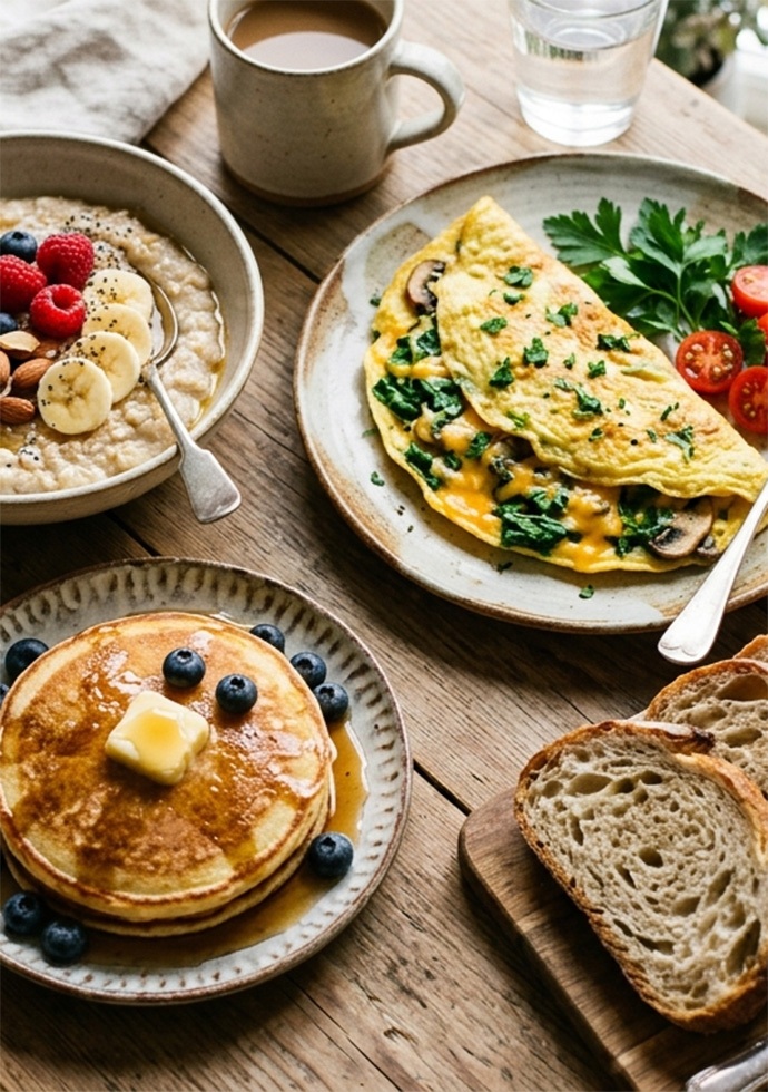 La colazione è il primo snodo strategico della giornata. Si fa ore prima della partenza, ed è ormai lontana dal vecchio "piatto di riso bianco": porridge, omelette, pancake, pane, uno snack proteico vicino all'orario del via. Non comfort food — carburante programmato.